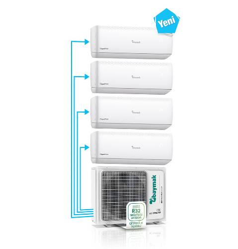 Multi split klima çoklu iç ünitelerin kontrol edilebilmesini sağlarken binaların dış cephe alanlarında tasarruf, enerjide düşük sarfiyat ve R32 Çevreci gazıyla kullanım rahatlığı ve memnuniyeti sağlıyor.